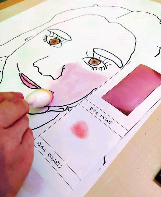 Ogni riquadro connota le identità individuali: infatti riproduce, per ciascun bambino e bambina di nido, infanzia e primaria, il colore specifico della propria pelle, siglato dal proprio nome autografato - segno dell’amore dei genitori: “un po’ uguali e un po’ diversi se no non ci riconosciamo”.