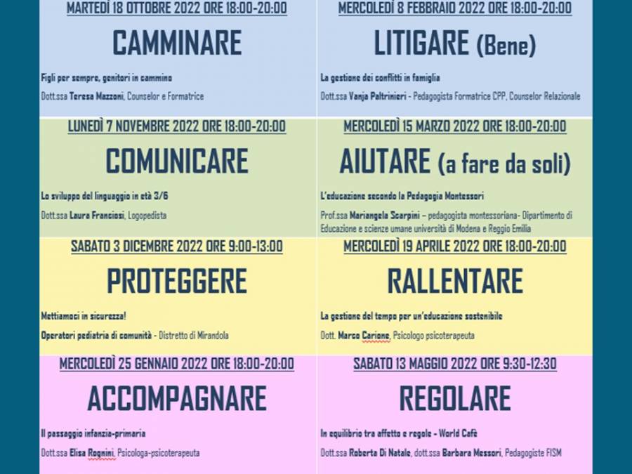 Il titolo di ogni singolo incontro è rappresentato da un verbo dell’educare, declinato al modo infinito, per sottolineare l’affascinante inesauribilità del ruolo educativo: non si finisce mai di educare ed educarsi!